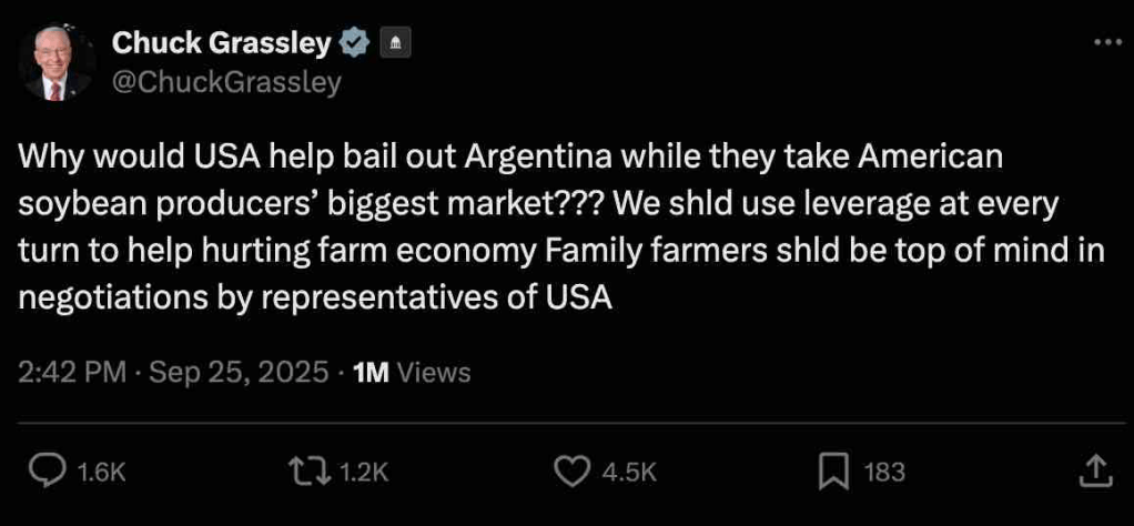 Several Republican lawmakers took to X to call out both the American and Argentine administrations, including Senator Chuck Grassley of Iowa:
